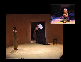 The second pattern which has been explored is called ′navigation by visualisation′. Instead of the proactive interaction request by a moderator, the viewer is seduced to switch by providing audiovisual temptations. The idea is to not break the story flow and the tension but instead give the viewer some subtle audio-visual clues on the actions in another story path. In our production this is achieved by attaching a small moving window showing the current scenery of another story path without sound (Figures 4 - 9 ).