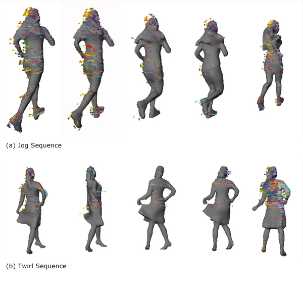 Figures 10(a)-(c) show the single view matching results on a 3D surface of a mesh. These results correspond to the 2D matching results shown in Figure 4. For each of the figures in Figure 10, there exists a starting mesh and the target mesh overlapping the former. The coloured lines in between the meshes are links of the corresponding matched features between the two meshes/frames. These links can be used for tracking of features from frame to frame in a video sequence as is shown in Figure 11. Figure 11(a) shows a sample of mesh frames for the Jog sequence and Figure 11(b) is for the Twirl sequence. The links are features matched in 2D texture space in a specific camera view and is colour coded in the following manner: (i) Camera 0 - red, (ii) Camera 1 - orange, (iii) Camera 2 - yellow, (iv) Camera 3 - green, (v) Camera 4 - blue, (vi) Camera 5 - indigo, (vii) Camera 6 - violet and (viii) Camera 7 - cyan. From these figures, our understanding of different motion characteristics and problems faced for feature selection and matching during motion or non-rigid surface deformation is increased. The feature matches can also be used as a starting point to compute sparse-to-dense correspondences of the whole mesh which can be warped for mesh animation purposes.